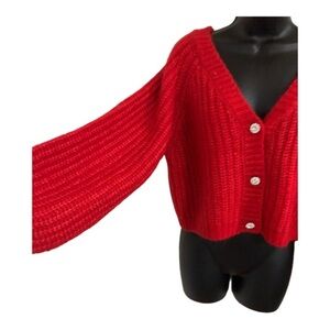 Jeasica Simpson red chunky knit fuzzy bejeweled button v-neck long sleeve cardigan size Medium new