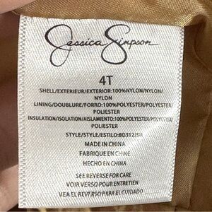Adorable Jessica Simpson size 4T puffer vest, new. Tan with snap front, functional snap-close pockets (ie: snack holes!!). Nylon shell with polyester fill. Neutral color is great for fall!