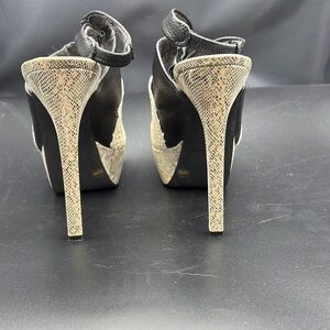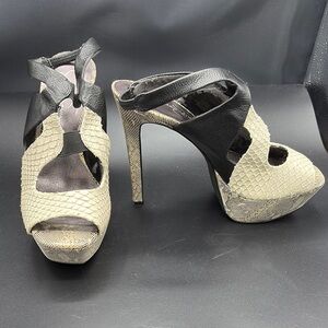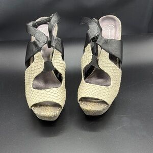 Elevate your style with these chic Jessica Simpson heels, featuring a sophisticated black and cream color palette. Snake printed for that edge, Perfect for any occasion, these shoes combine elegance with comfort, making them a versatile addition to your wardrobe.