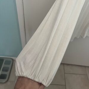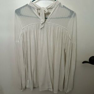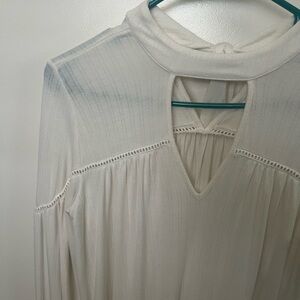 This elegant blouse by Jessica Simpson features a relaxed fit with a high triangle cut out neck line with intricate cut out details throughout and a tie bow keyhole back. Crafted in a soft cream hue, it offers a sophisticated look with its long sleeves and flowing silhouette. perfect for any occasion. Semi sheer. PTP is 18”, L is 25”