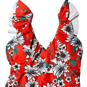 This Jessica Simpson one piece Beautiful bathing suit is perfect for a vacation, beach, and ir pool. Featuring: ruffle shoulder straps, one piece, plunging v-neckline, non removable cups, and modest bottom coverage. In a gorgeous salsa red/deep coral color with pretty white daisy flowers with yellow center and green leaves & black outline.