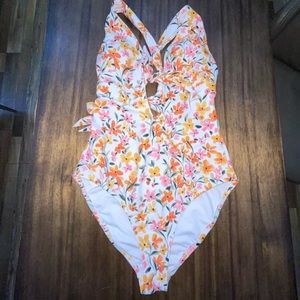 A plunging tie-front neckline tops off this dreamy one-piece swimsuit from Jessica Simpson.