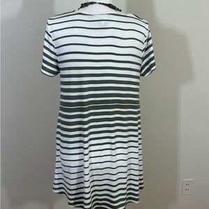 Such a cute top olive green stripes. Lightweight knit fabric. Great. Weight for summer or in cooler weather layer it under a sweater, hoodie, jacket etc Measurements are pit to pit flatfold about 20”. The total length from shoulders to hem is about 32”. The top length is the same in the front and back. No visible flaws. Questions please ask and we will answer questions ASAP. Z