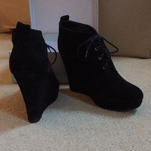 Black oiled suede in excellent condition with 4 1/2 inch suede, wedge heel