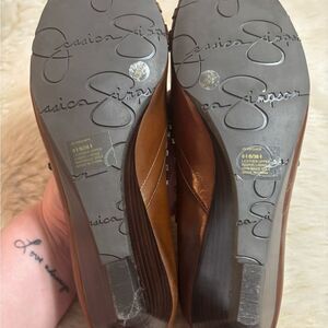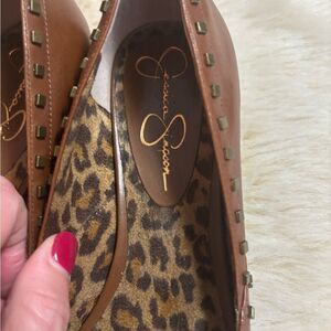 Experience comfort and style with these Jessica Simpson brown flats, featuring a woven texture and a chic peep-toe design. The leopard print lining adds a playful touch, while the minimal heel height ensures all-day wearability. Perfect for casual outings, these flats effortlessly blend elegance with everyday practicality.