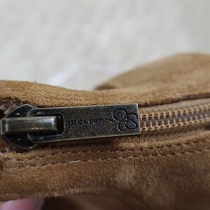 Jessica Simpson Dacia Perforated Leather Ankle Boots in tan suede. Padded insole with a rubber outer sole. Zips at heel. Size 7.5M