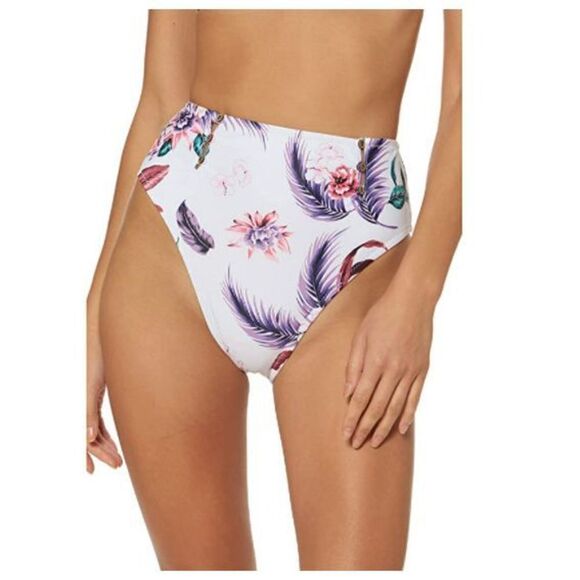 Jessica Simpson Sz L White Multi Floral Button High Waisted Swimsuit Bottom $58