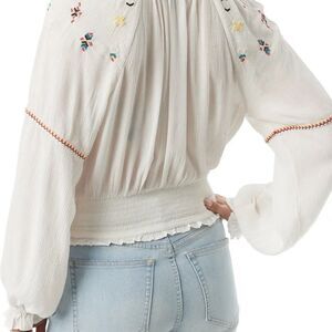 This relaxed blouse by Jessica Simpson features a charming tie front and intricate red embroidery, offering a bohemian flair. The white fabric is complemented by long sleeves and a comfortable fit, making it a versatile addition to any wardrobe. Perfect for casual outings, this top combines style and comfort effortlessly.