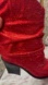 The boots showcase a rich red hue with a ruched texture along the shaft, complemented by a medium-height chunky heel for added comfort and style. Color: RED sequence, sparkle, cowboy slouchy, boot.
