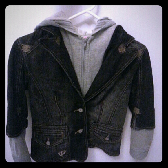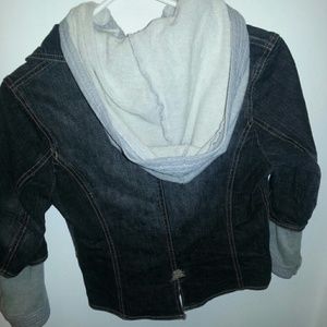 Jessica simpson Denim jacket with a grey cotton hood and 3/4 sleeves. Super cute on. Id model it but its too small for me. No rips or stains.