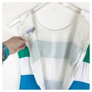 Jessica Howard by Mitchel Rodbell Vintage Sleeveless Linen Broad Blue/White/Green Stripes Sheath Dress Sz 4 EUC. throw on a jacket and you are ready for the office/work/career. Add sandals and head to the party or wedding. Dinner out on vacation? Lining has yellowed but the dress itself in in great shape as shown. Please see photos for additional details.