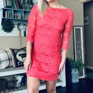 Jessica Howard hot pink/coral lace overlay fringe trim mini dress