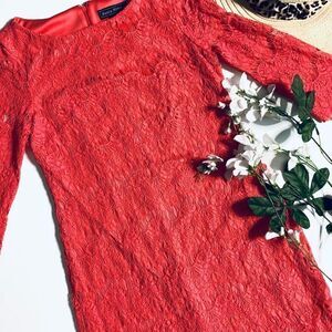 I’m good used condition. The color of this one is so bright and vibrant. Lace overlay and lined underneath. Zips about half way up the back. There is some minor pilling to some of the lace as pictured - mostly on the fringe. Not noticeable when wearing. Quarter sleeves. Would make a cute and comfortable homecoming dress! Size 6