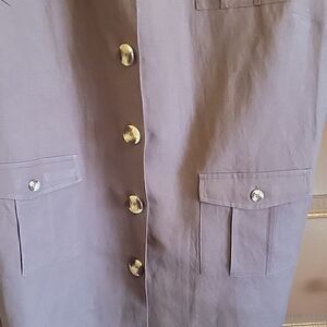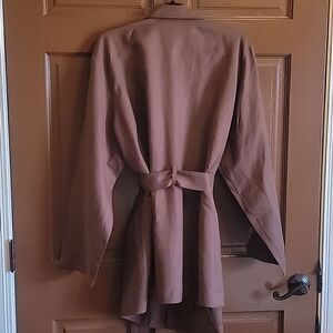 Shirt/Jacket is long Sleeved with the option to roll. Pocket on each side at top. Pocket on each side at bottom. Brown fabric belt. Measures Pit to Pit 28 1/2 inches. Shoulder to Hem 33 inches. NWT. STEAMED.