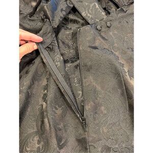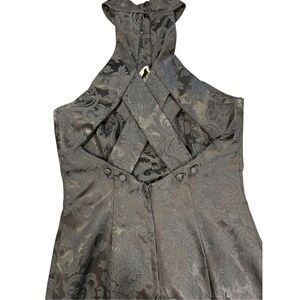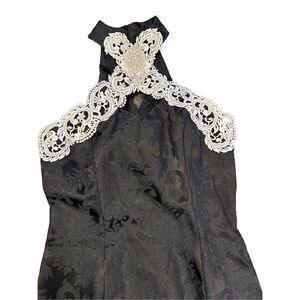 Beautiful high choker coller with beading and lace trim on a black brocade bodice. Bodycon fitted and just above knee with zip up back and button closure criss cross back.