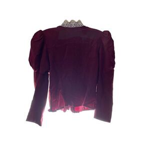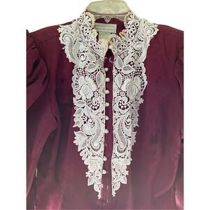 Jessica McClintock. Vintage burgundy lace trim, puffy sleeve button-down blouse