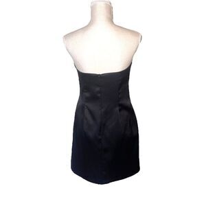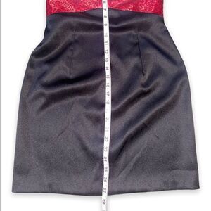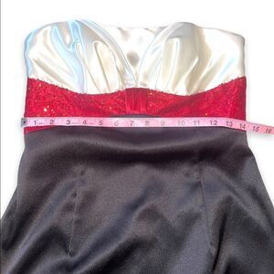 Gorgeous red, white and black formal strapless cocktail mini dress. Retro/vintage Jessica McClintock for Gunne Sax. Silky and stretchy body with tiny sequins adorning the red center piece. Zipper back. Polyester & spandex blend.