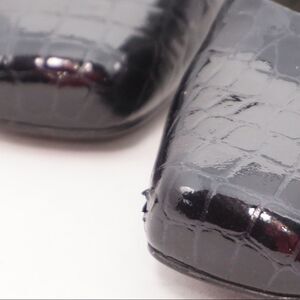 Black croc-textured patent leather with approximately 4.5" squared heel