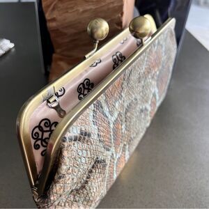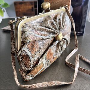This Jessica Simpson clutch bag features a sophisticated faux snakeskin exterior with an elegant gathered detail secured by a brass-tone clasp. It has a vintage-inspired kiss-lock frame closure and a slim, detachable strap for versatile wear.