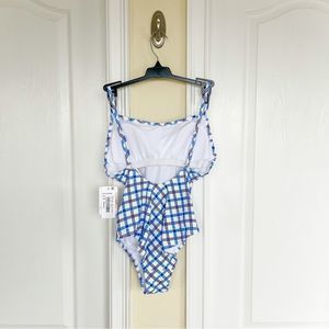 Jessica Simpson Small Bodysuit Bathing Suit Checkered Blue White Open Front Bow