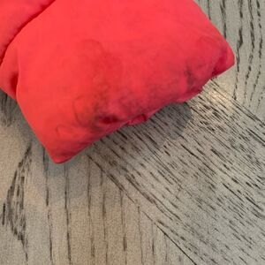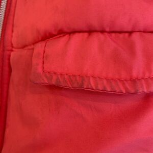 Pink puffer coat with functional pockets, fur trimmed hood, some wear/stains on cuffs and pocket flaps.