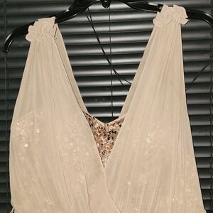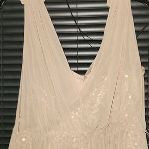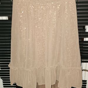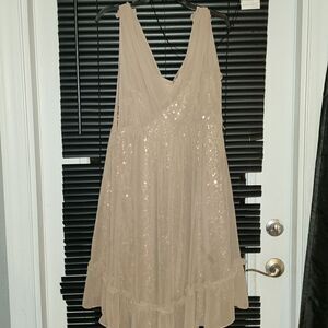 sequined and sheer tan babydoll mini dress with ruffle hem
