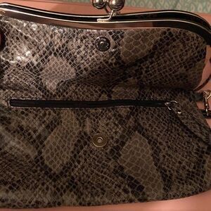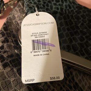 Beautiful Jessica Simpson purse that can be carried as a clutch or over the shoulder. It is jade/grey snakeskin print with a zipper on the inside of the folded part, magnetic closure and snap silver tone too closure.