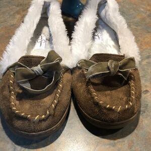 These are medium shoes in EUC. There is a sturdy sole on there for maybe even running errands lol. Brown in color with faux fur lining.
