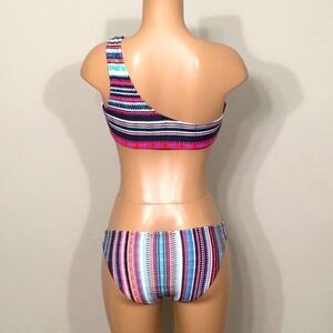 New. Multicolored stripe one shoulder bikini set. Bold cutouts line the length of a single shoulder strap in this asymmetrical bikini from Jessica Simpson