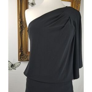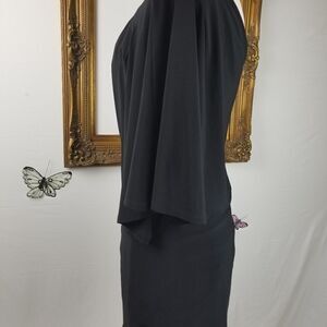 Black Mini dress or can be worn as a long shirt or tunic form fitting and stretchy with one shoulder flutter sleeve overlay