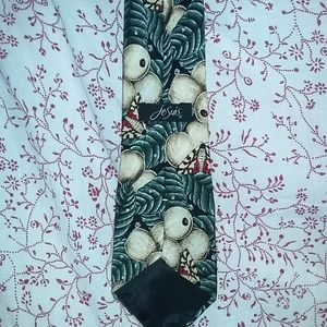 Jesuis Tie that ha a scene of moths landing on a tree with green leaves and white berries. 100% silk