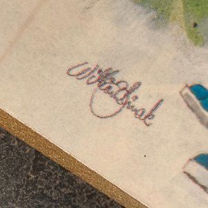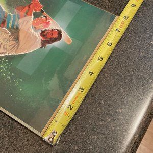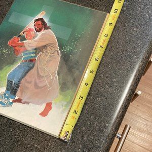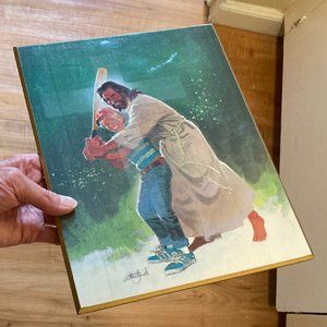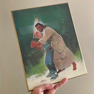 Good used condition. The gold trim is in very good condition. The finish on the front is subtly shiny. The front has minor scuffs in the finish. Measures approximately 7.5 x 9.75". Appears to be newer item with vintage look. Primary color is green, almost teal. #kitsch #christian #christianity #baseball
