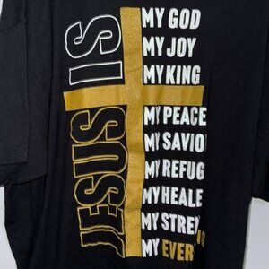 This unisex black t-shirt features a bold "Jesus Is" graphic design with inspirational text in white and gold. Crafted from a soft cotton blend, it offers comfort and durability for everyday wear, while its relaxed fit ensures versatility and style for various occasions.