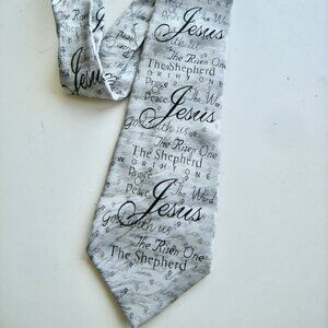 A great gift for a religious person. 100% silk men's tie in light gray with Jesus themed words.