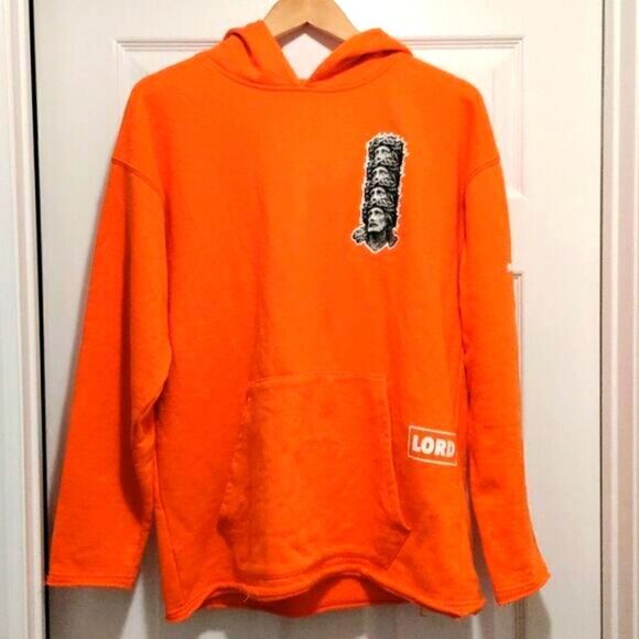 Awesome orange hoodie with Jesus graphic, cross, and "Lord Is My Shepherd" declaration on back. In great condition, no major flaws.