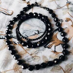 Jet Black Glass Necklace and Memory Wire Bracelet Vintage Smooth Facets Mourning
