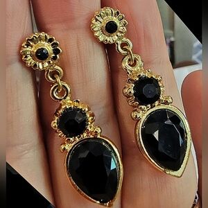 Jet Black Onyx Teardrop Faceted Gold Tone Drop Dangle Earrings 1.62" long