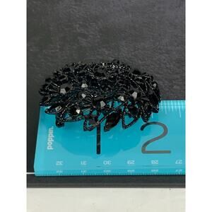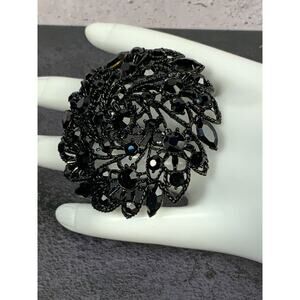 The product is a vintage mourning brooch featuring jet black stones and a blackened frame. It is a statement piece with a black color theme, making it a unique and elegant addition to any outfit. The brooch is crafted with rhinestones, metal, and glass, giving it a luxurious feel. It is not signed and has a vintage charm that adds timeless elegance to any ensemble.