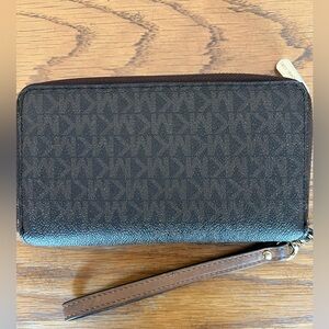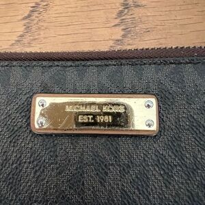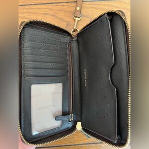 Crafted by the renowned Michael Kors, this Jet Set Signature Logo Smartphone Wristlet in a rich brown hue is the epitome of both fashion and function. Its sleek leather design provides a luxurious feel, while the spacious interior offers ample room for your smartphone and essentials, ensuring they're always within easy reach.