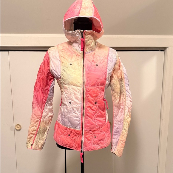 Rainbow sherbet colors. Excellent condition. No damage. This hacker has an attached hood.