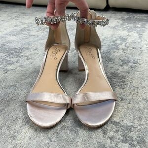 Jewel Badgley Mischka Catalina Block Heel Sandal Jewel Ankle Strap Satin Sz 8