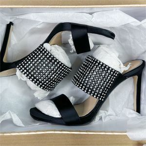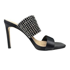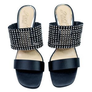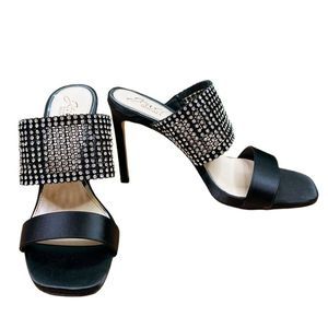 Black satin, open toe, double strap - one rhinestone encrusted thick strap & one thin black satin strap, slip on style