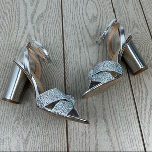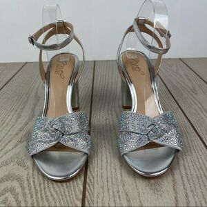 EUC Jewel Badgley Mischka Gem Vamp Ankle Strappy Block Heel Nicoline Evening Sandals, size: 8.5M women's, color: Metallic Silver.
