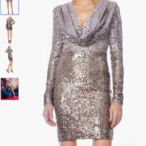 8, BROWN SILVER True to size. Details & care Wear a dazzle-drenched dress to cocktail hour that skims your curves, shows off your legs and clearly matches your sparkling wit. Cowl neck Long sleeves Lined 95% polyester, 5% spandex Spot clean Imported
