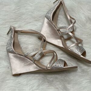 Perfect shoe to wear to a wedding! Just a hint of pink in this strappy wedge heel that is adorned with sparkly rhinestones/crystals for that perfect bit of bling! Zippered back for easy on/off.