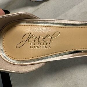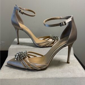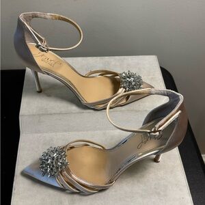 These stunning rose silver heels from Jewel Badgley Mischka feature a sleek stiletto design with a delicate ankle strap for a secure fit. The elegant strappy silhouette and metallic finish make them perfect for formal occasions, adding a touch of sophistication to any outfit.