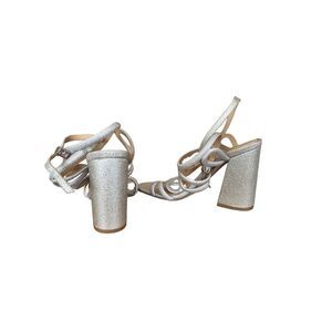 Jewel Badgley Mischka Womens Silver Glitter Ankle Strap Block Heel Sandal Size 7
