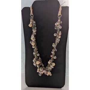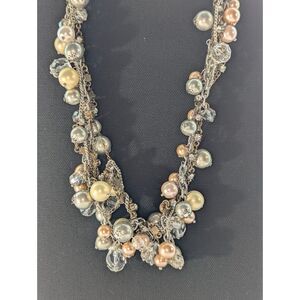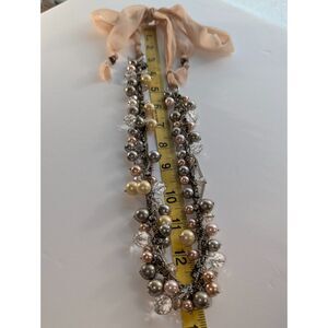 Faux pearls in varied colors and sizes with a mix of chain, bead and rhinestones. Tie closure. Measurements are approximate. Beaded portion of necklace is about 18n inches, ribbon each length is 20 inches.