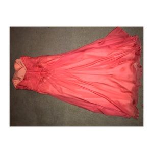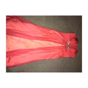MORE PICTURES UPON REQUEST ! :) Orange/Red prom dress with jewels near bust. Zip up in the back. Has hooks inside for straps. straps not included. Size 12. Has hole as pictured on the side of dress and at bottom do to my heel snagging the material but is not noticeable when worn! Some snags have been fixed already! in the front it also breaks away to flow and show the underneth which is a light orange!