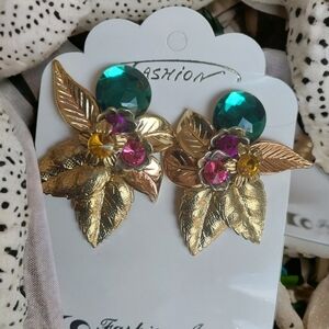 Enhance your jewelry collection with this set of three Jewel Tone Fashion Clip on Earrings Gold Leaves Lightweight Jewelry. The earrings are designed in a round shape and feature simulated stones in multicolor. The clip-on closure ensures a comfortable fit, making it suitable for lobe ear areas.